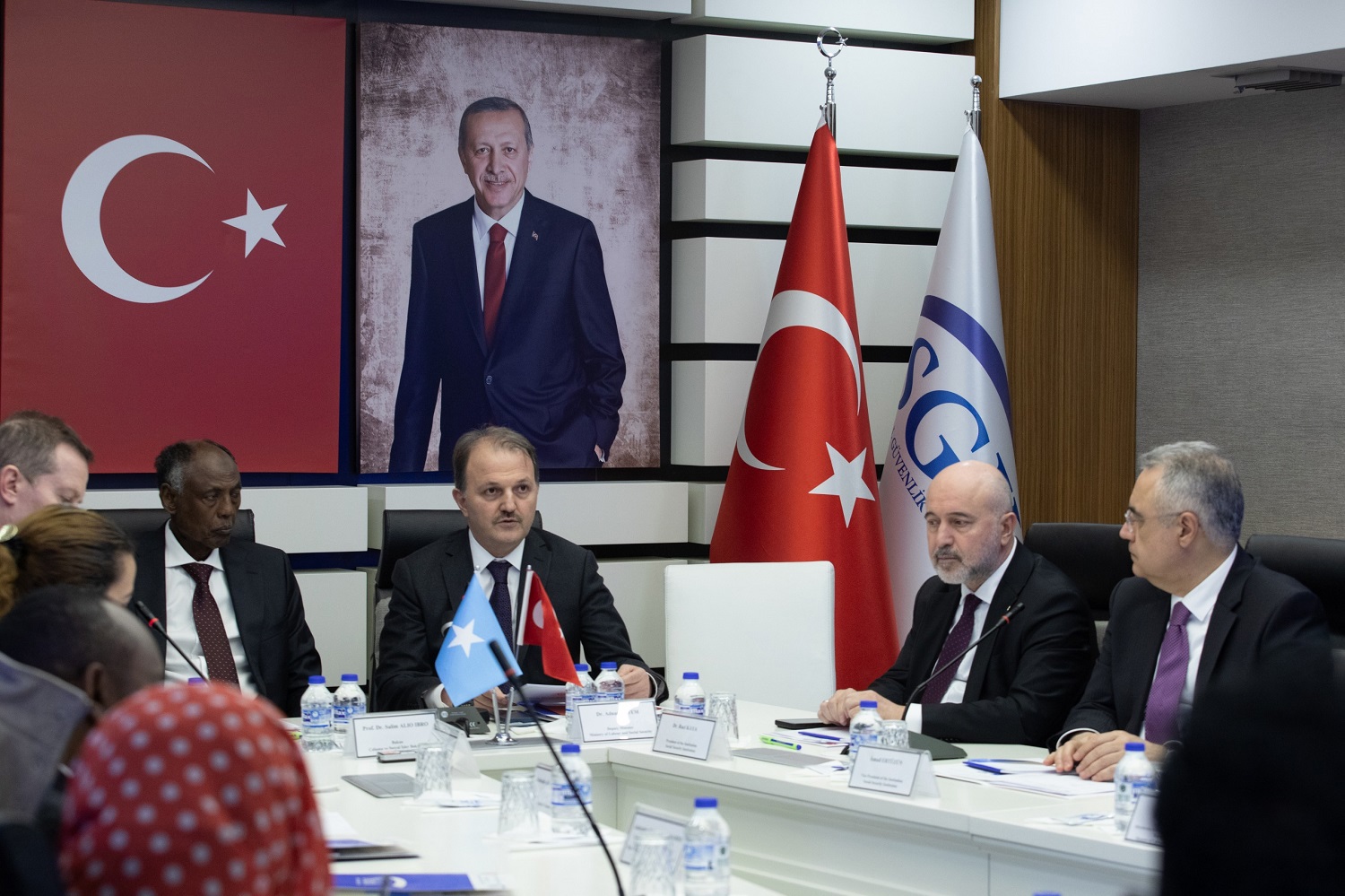 SGK Başkanlığı Binası Neşet Ertaş Toplantı Salonu’nda yapılan toplantıya, Çalışma ve Sosyal Güvenlik Bakan Yardımcısı Dr. Adnan Ertem, Somali Federal Cumhuriyeti Çalışma ve Sosyal İşler Bakanı Prof. Dr. Salim Alio Ibro, SGK Başkanı Dr. Raci Kaya, SGK Başkan Yardımcısı İsmail Ertüzün, ÇSGB Dış İlişkiler ve Avrupa Birliği Genel Müdürü Ali Aybey, ÇSGB Dış İlişkiler ve Avrupa Birliği Genel Müdürü Dr. Selim Dağlıoğlu, SGK Strateji Geliştirme Başkanı Yakup Koç, SGK Emeklilik Hizmetleri Genel Müdür Yardımcısı Necmettin Öz, SGK Genel Sağlık Sigortası Genel Müdür Yardımcısı Uzm. Dr. Kerim Abatay, SGK Sigorta Primleri Genel Müdür Yardımcısı İbrahim Özçelik, SGK Strateji Geliştirme Başkanlığı Avrupa Birliği ve Dış İlişkiler Daire Başkanı Sedat Budak ÇSGB  Dış İlişkiler ve Avrupa Birliği Genel Müdürlüğü Protokol Daire Başkanı Hakan Öz katıldı.